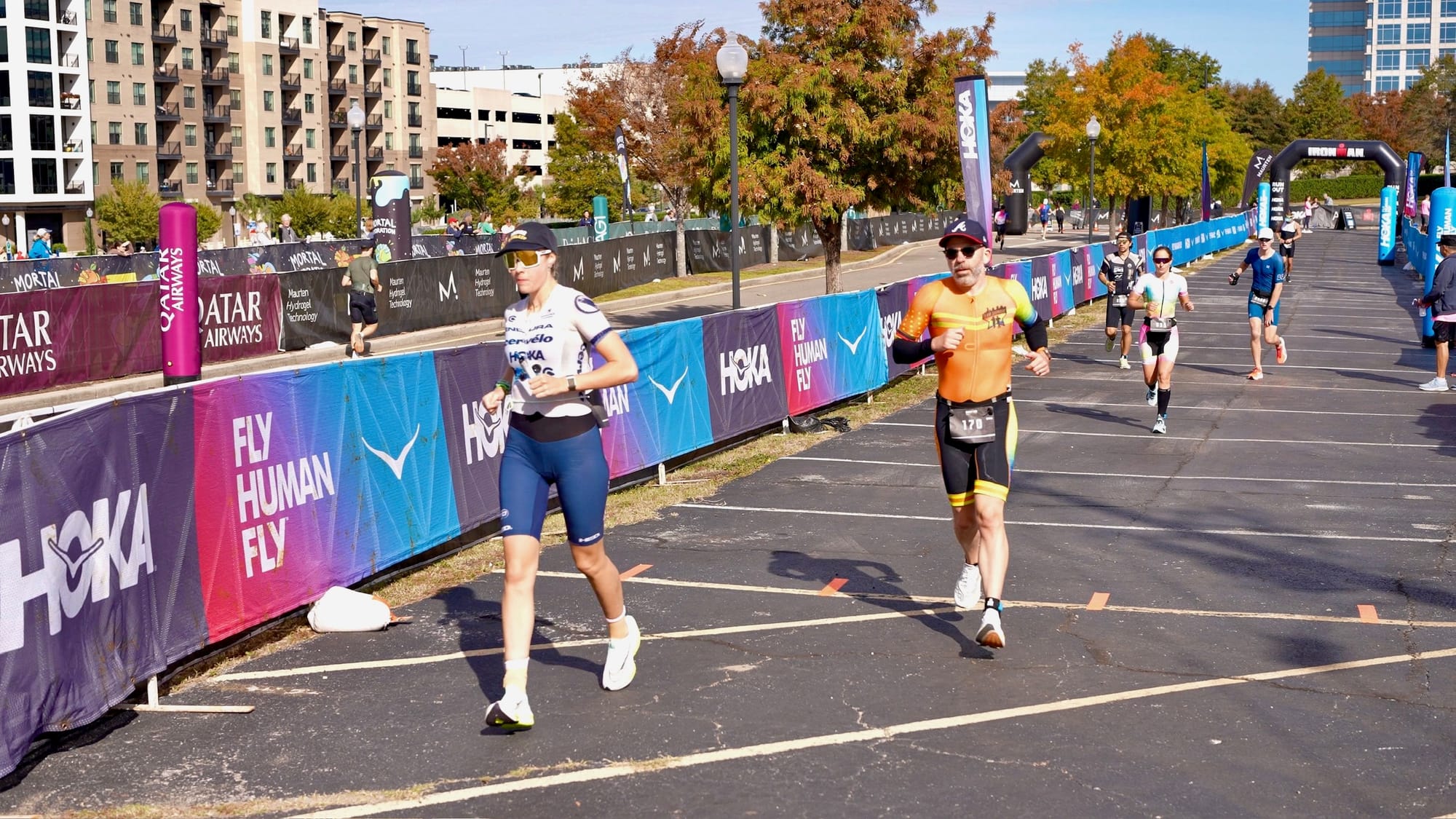 I didn’t relish the idea of running barefoot on that asphalt. Ironman does put down carpet over some of the rougher areas, but it turns into a bottleneck of athletes. The carpet is only two people wide at most. In my shoes, I skipped the crowded carpet entirely, sprinted down the asphalt, and ended up passing a couple dozen people on our transition run.